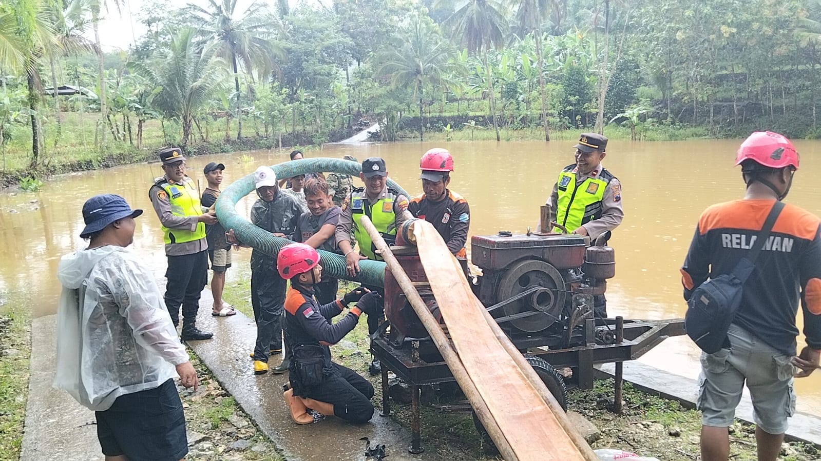 Kapolsek Pracimantoro AKP Bunal Eko Trilaksono memimpin langsung kegiatan bersama personel Polsek Pracimantoro, BPBD Kabupaten Wonogiri, Koramil 13 Pracimantoro, relawan Prabu, pemerintah desa, serta masyarakat setempat. Petugas BPBD membawa genset penyedot air, sementara aparat TNI-Polri dan warga bergotong royong membuat saluran untuk mengalirkan air menuju jalur irigasi terdekat.