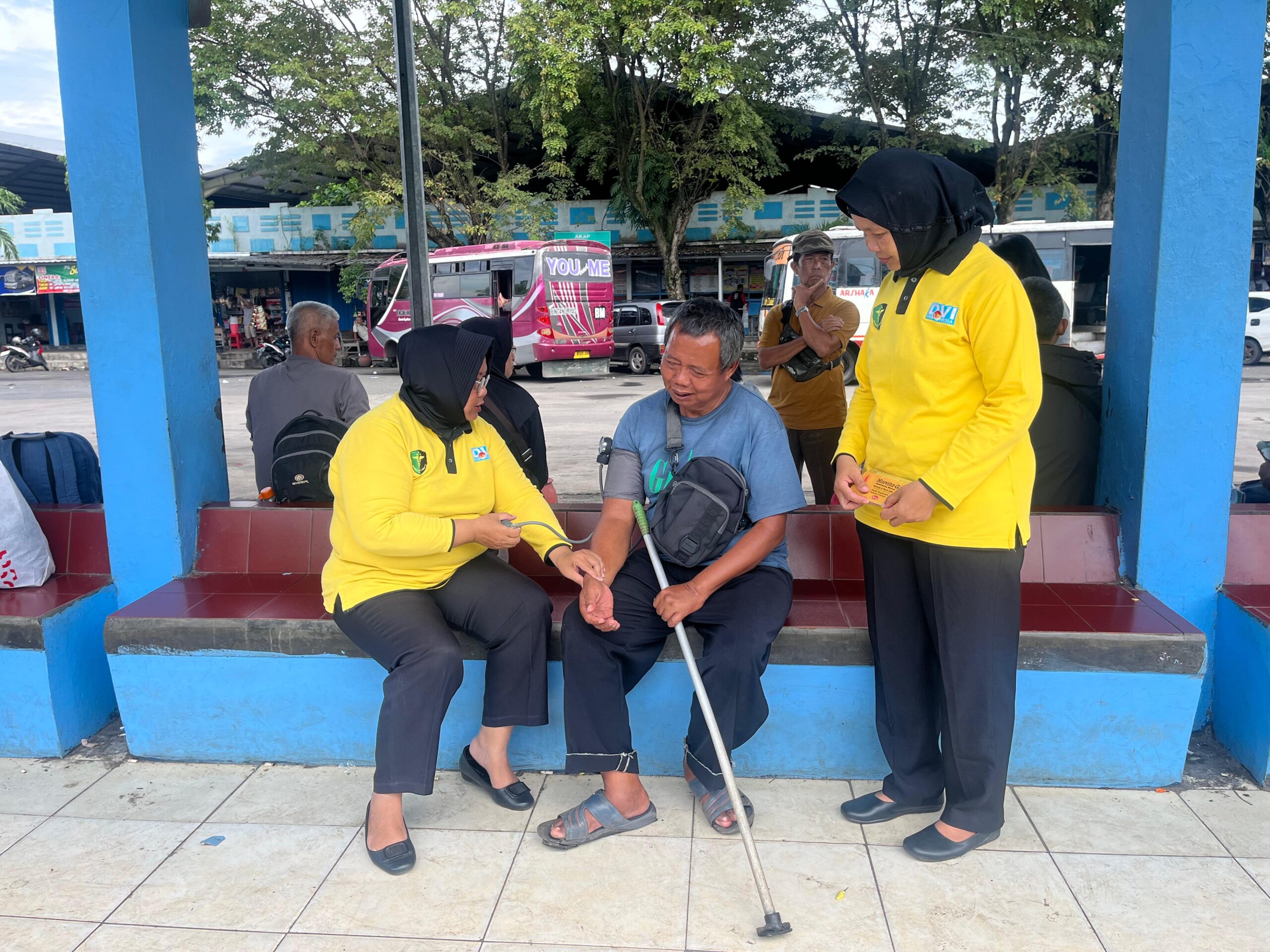 Pelayanan kesehatan pertama dilaksanakan sekitar pukul 09.30 WIB di Terminal Kembang Joyo, Kota Pati. Di lokasi ini, tim Dokkes memberikan pemeriksaan kesehatan berupa pengecekan tekanan darah kepada masyarakat yang beraktivitas di terminal. Hasil pemeriksaan menunjukkan kondisi masyarakat dalam keadaan sehat dan stabil.