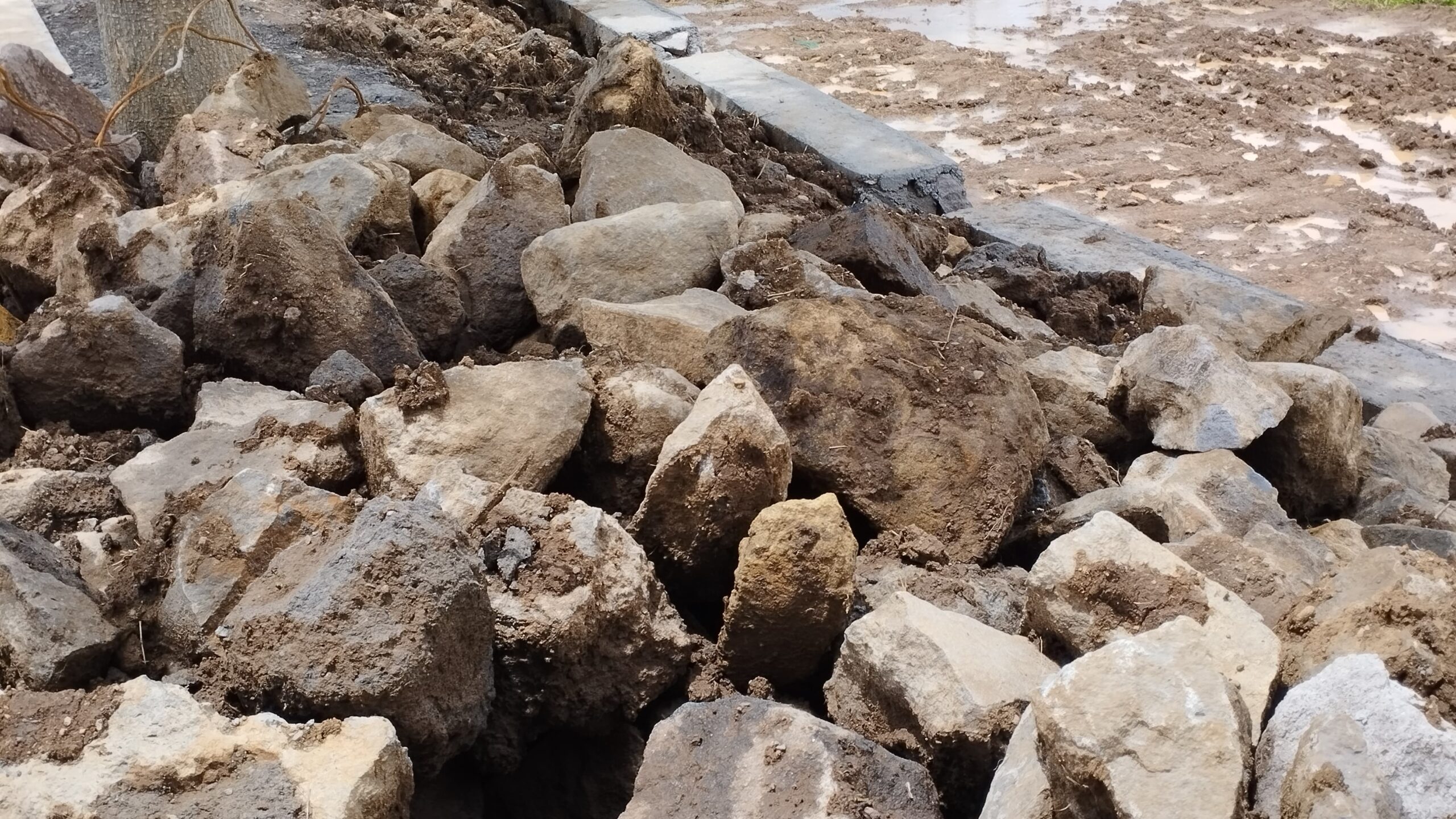 Selain itu, jenis batu yang digunakan juga diduga tidak sesuai spesifikasi teknis. Alih-alih memakai batu belah baru, pelaksana proyek tampak menggunakan batu bekas yang masih menempel sisa semen lama.