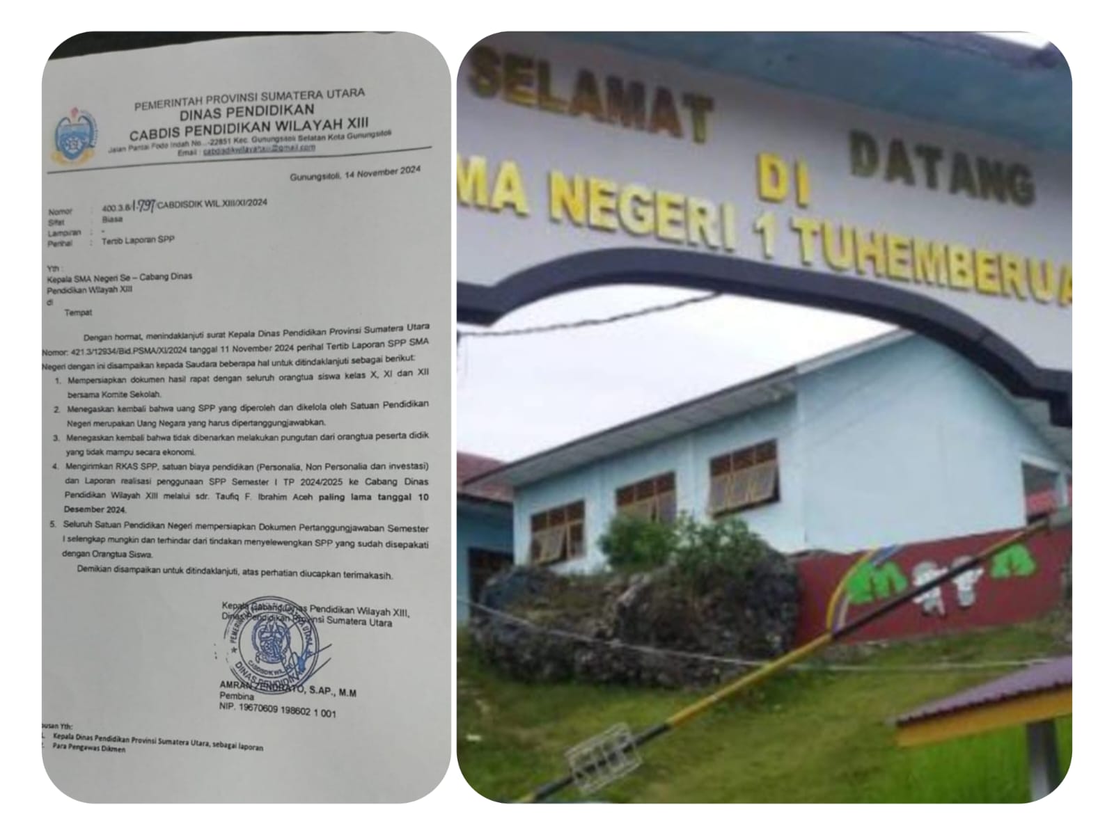 Mereka juga mengacu pada Surat Edaran Dinas Pendidikan Provinsi Sumatera Utara melalui UPT Dinas Pendidikan Wilayah XIII Nomor: 4003.8/797 Cabdisdik Wil XIII/XI/2024 tentang Tertib Laporan SPP SMA Negeri, yang merupakan tindak lanjut dari surat Kepala Dinas Pendidikan Provinsi Sumatera Utara Nomor: 421.3/12934/Bid.PSMA/XI/2024 tertanggal 11 November 2024 tentang Tertib Laporan SPP SMA Negeri.