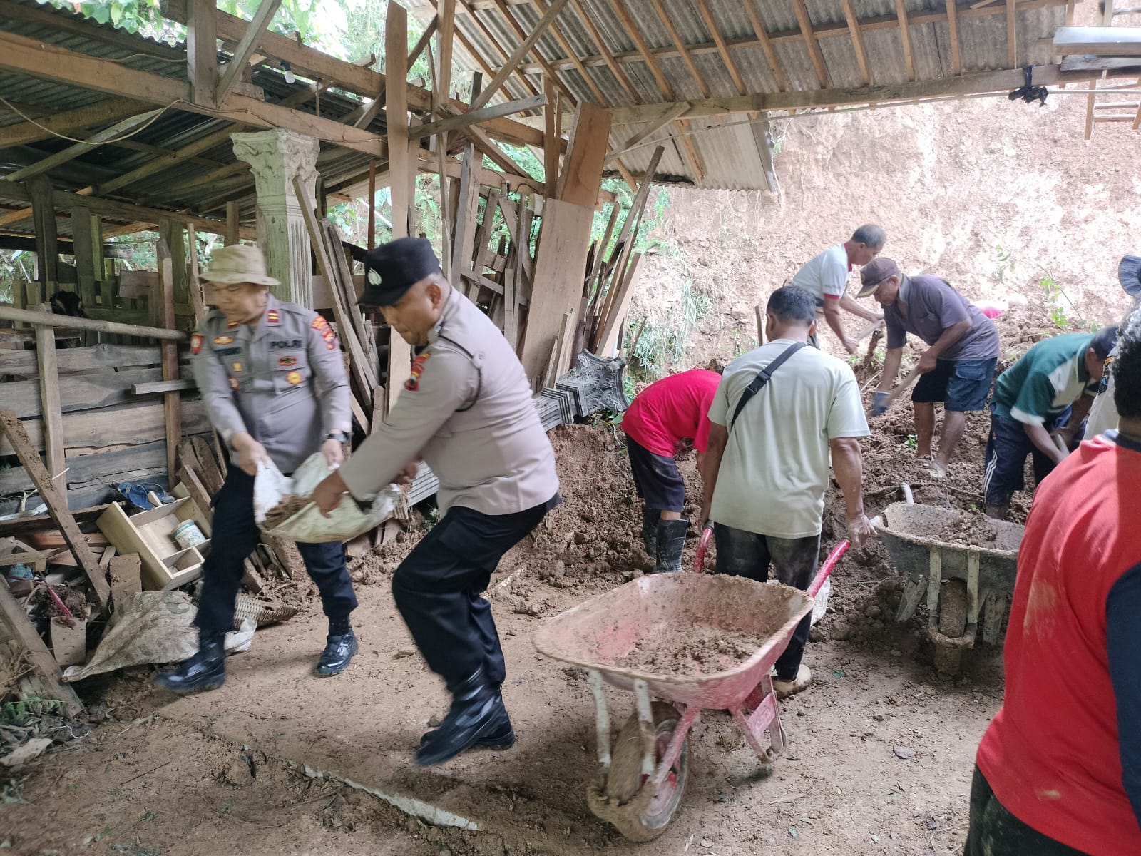 Sejak pagi, personel Polsek Jatipurno bersama unsur Forkopimcam dan masyarakat setempat melakukan kerja bakti membersihkan material longsor yang masuk ke dapur rumah milik Wakidi, warga yang terdampak. Langkah cepat tersebut dilakukan untuk memastikan keamanan lingkungan sekaligus mempercepat pemulihan pascabencana.