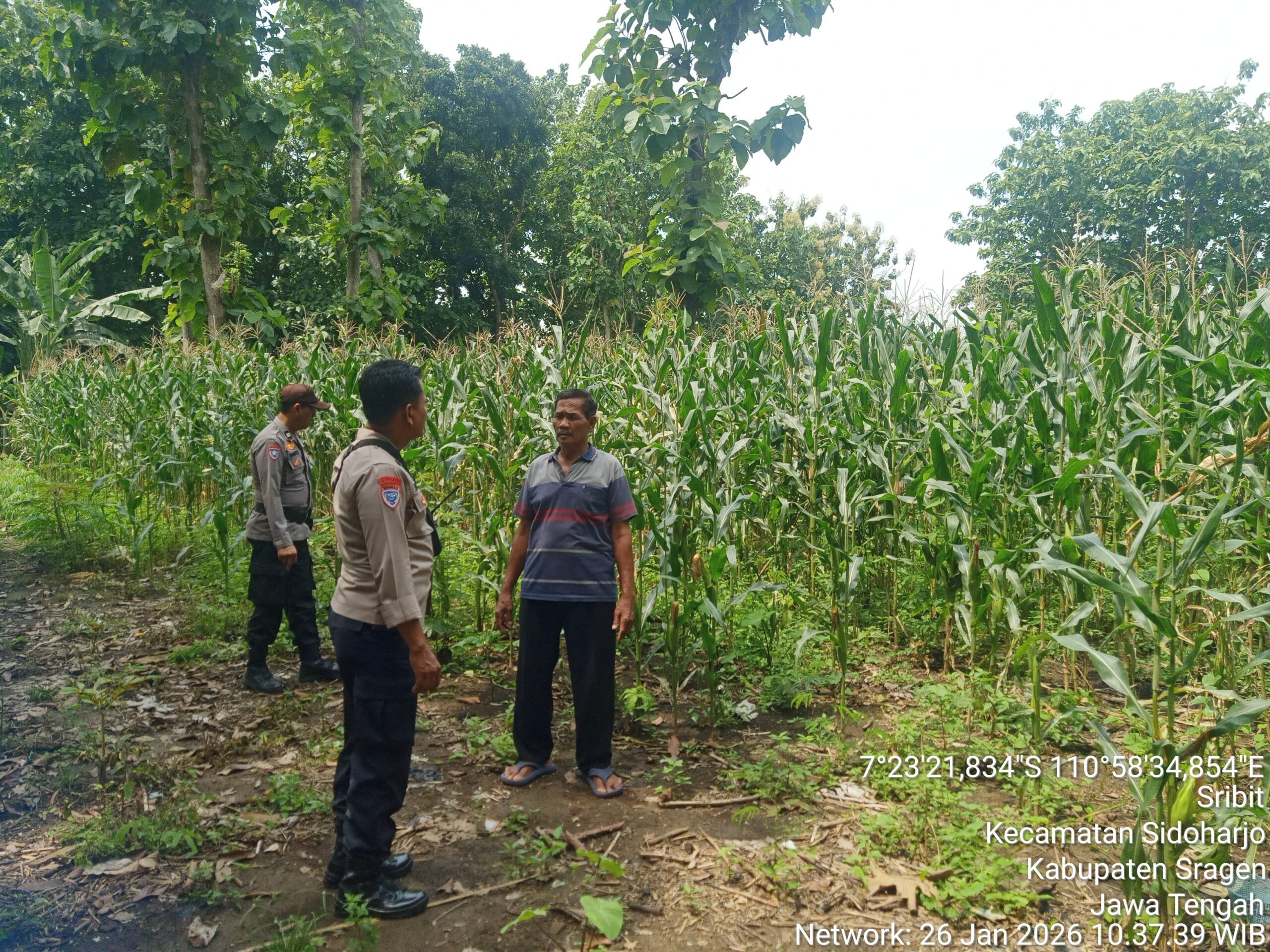 Pada Senin pagi (26/1/2026), personel Polsek Sidoharjo turun langsung ke lahan pertanian untuk melakukan pengecekan pertumbuhan tanaman jagung Masa Tanam ke-4 di Lahan Baku Sawah (LBS), wilayah Dukuh Cermo, Desa Sribit, Kecamatan Sidoharjo.