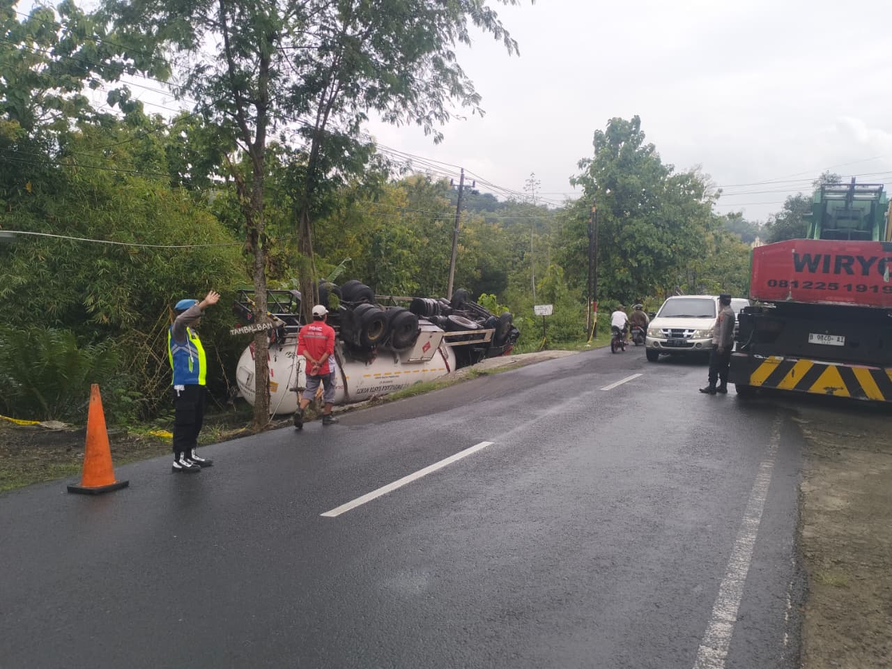 Truk tangki Pertamina milik PT Dwiparama Hasta Mukti dengan nomor polisi AE-8069-UX dilaporkan mengalami kecelakaan sekitar pukul 19.00 WIB. Kendaraan diketahui melaju dari arah Nguntoronadi menuju Tirtomoyo sebelum akhirnya keluar dari badan jalan.