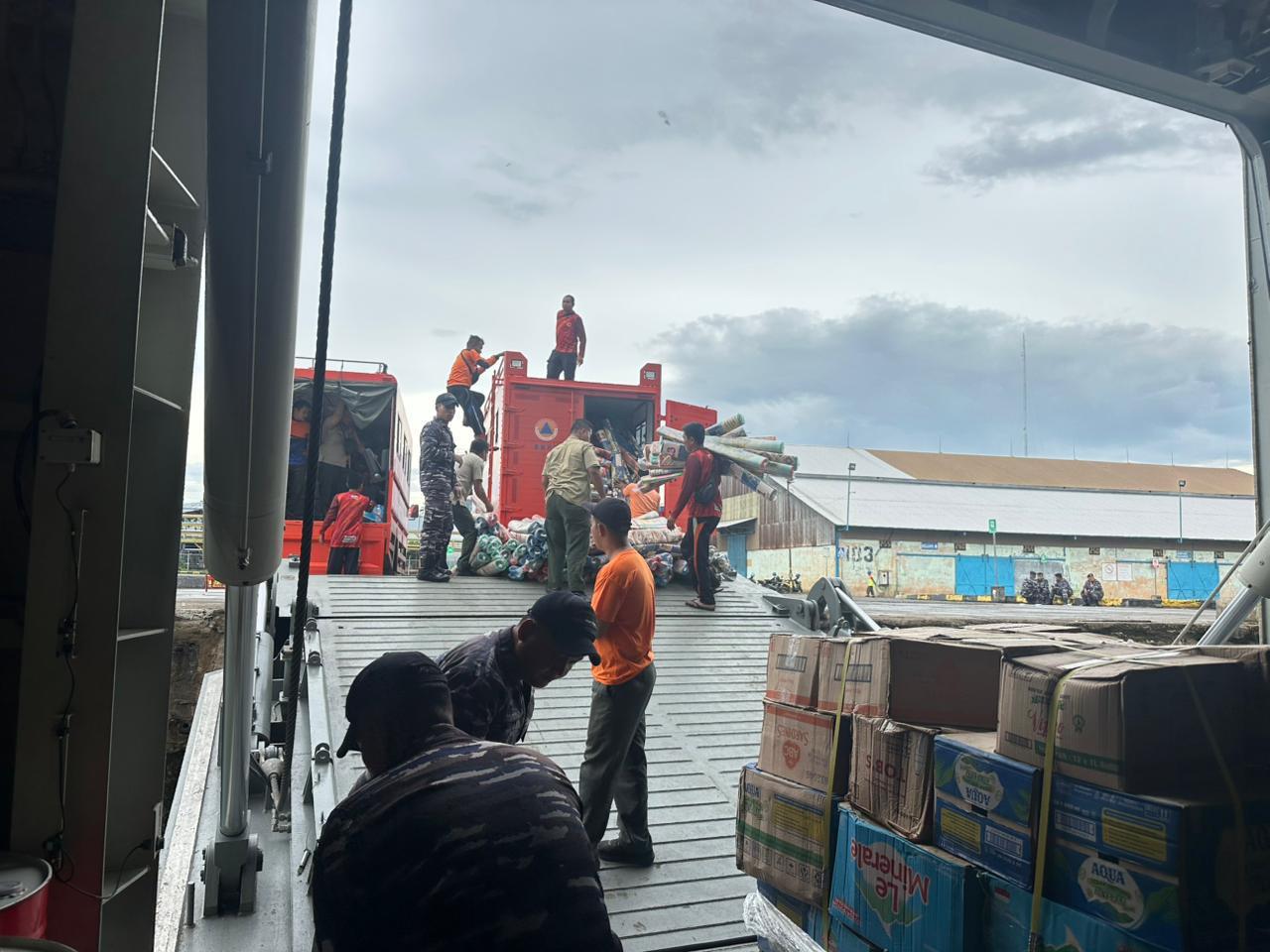 Selain bahan kontak, KRI Semarang-594 juga mendebarkasikan material pendukung berupa tenda serba guna, velbed, kendaraan operasional, serta kendaraan taktis guna menunjang kelancaran kegiatan bantuan kemanusiaan di daerah terdampak.