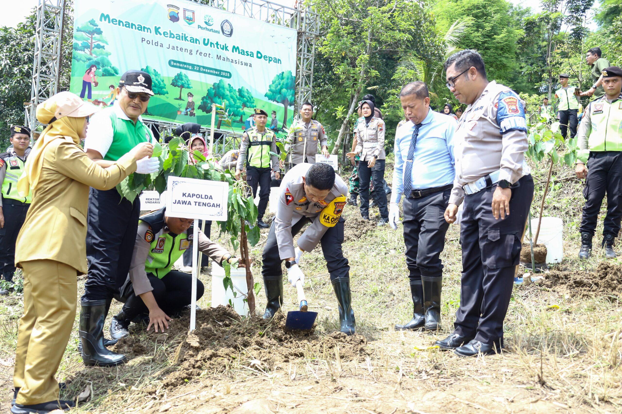 Dengan semangat gotong royong, Kapolda Jateng Irjen Pol Ribut Hari Wibowo bersama sivitas akademika UNDIP, kelompok tani, dan mahasiswa dari berbagai perguruan tinggi melakukan penanaman 11 ribu bibit pohon di lahan seluas 99,65 hektare.