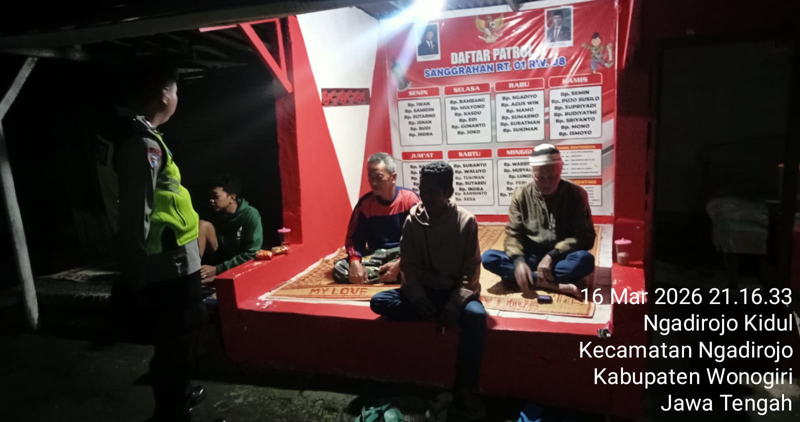 Wonogiriandalapost.id  – Personel Bhabinkamtibmas Polsek Ngadirojo Polres Wonogiri melaksanakan kegiatan sambang dan pembinaan kepada masyarakat di pos keamanan lingkungan (pos kamling) di wilayah Kecamatan Ngadirojo, Kabupaten Wonogiri, Senin (16/3/2026) malam.