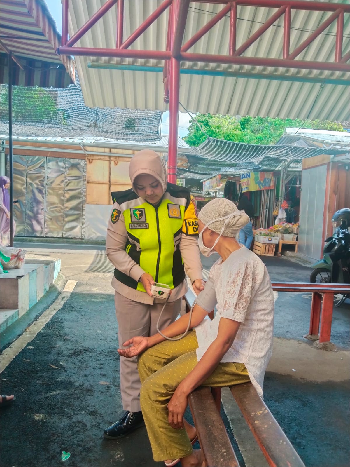 Dalam kegiatan tersebut, petugas memberikan layanan pemeriksaan kesehatan gratis berupa pengecekan tekanan darah (tensi) serta pemberian vitamin untuk membantu meningkatkan daya tahan tubuh masyarakat.