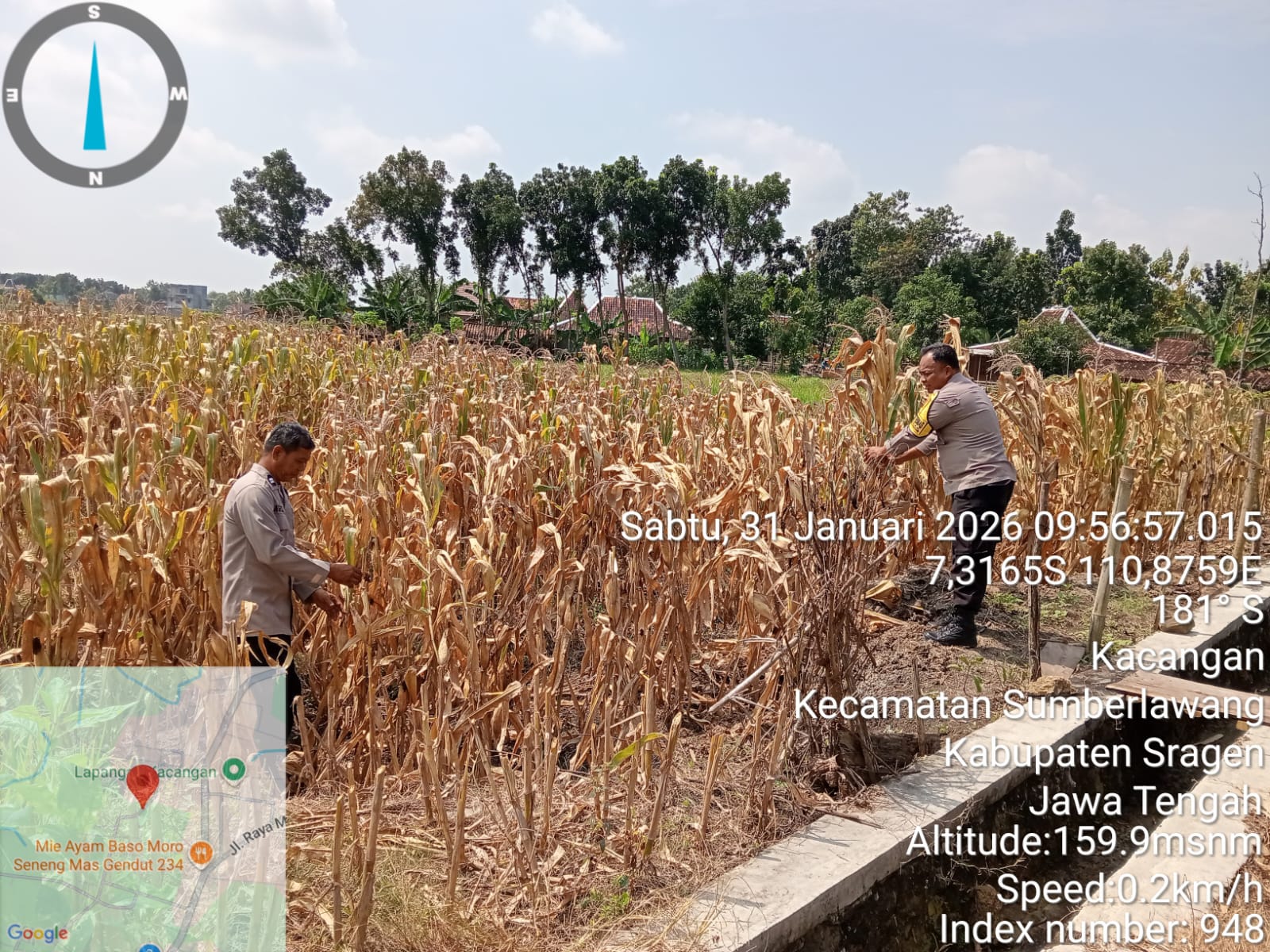 Pengecekan dipimpin oleh personel Polsek Sumberlawang dengan melibatkan Aiptu Suyamto, Aiptu Agus S., dan Aipda Slamet R. Lahan jagung seluas kurang lebih 1.000 meter persegi milik Wagiman, warga setempat, menjadi objek peninjauan.