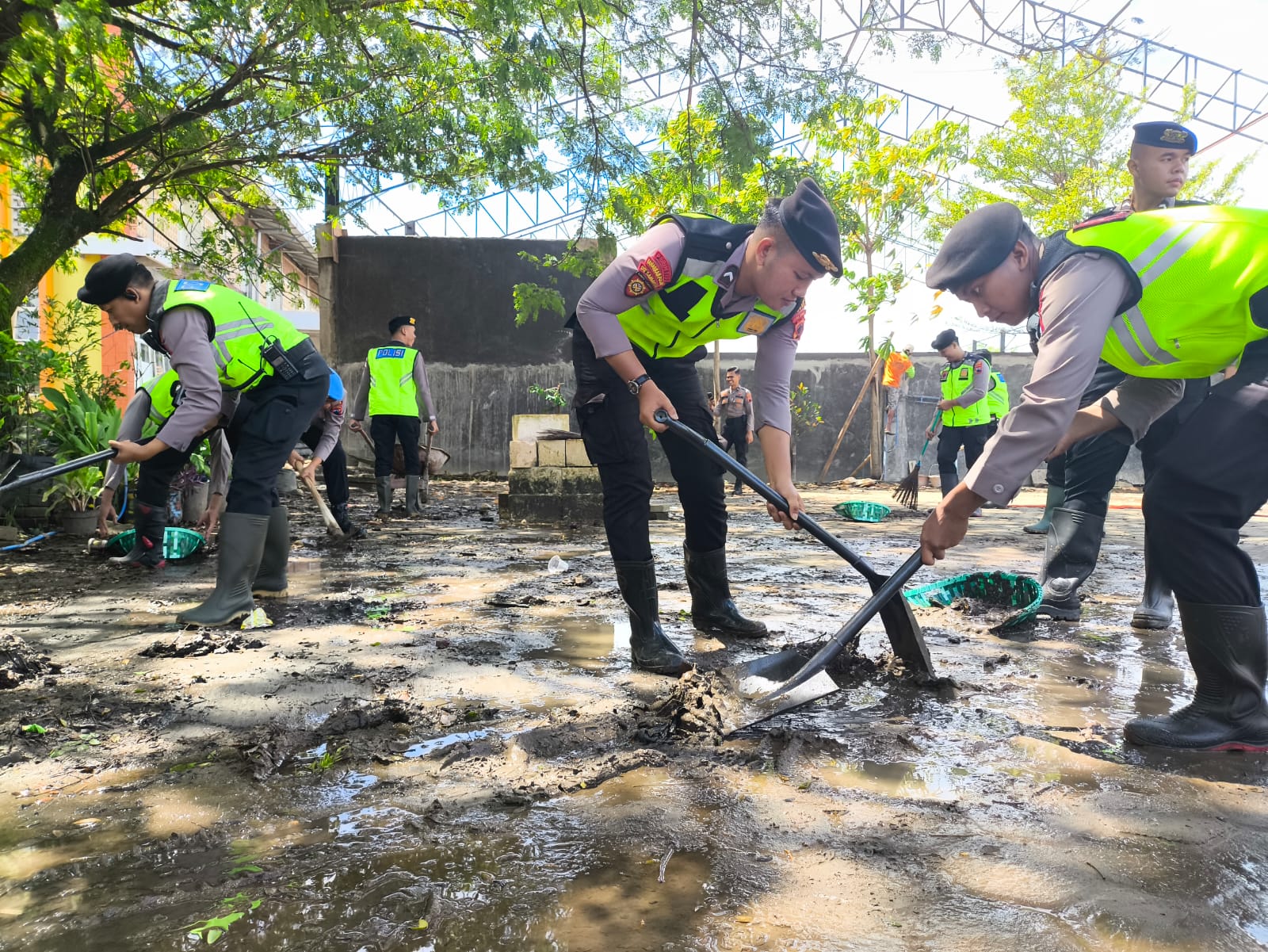 “Semoga dengan adanya kerja bakti ini, sekolah kembali ramah anak. Sebelumnya licin dan rawan kepleset karena lumpur sisa banjir,” kata AKBP Heru di sela-sela kerja bakti.