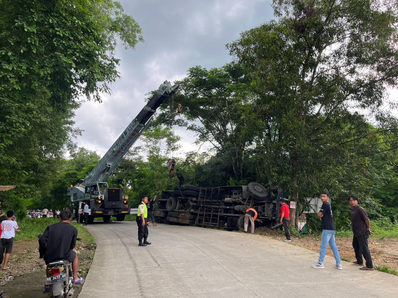 Peristiwa itu terjadi sekitar pukul 13.30 WIB dan langsung ditangani oleh personel Satlantas Polres Wonogiri. Truk Isuzu Tronton bernomor polisi AD-9587-AB diketahui melaju dari arah Wonogiri menuju Jatipuro sebelum akhirnya terguling ke sisi kiri jalan.